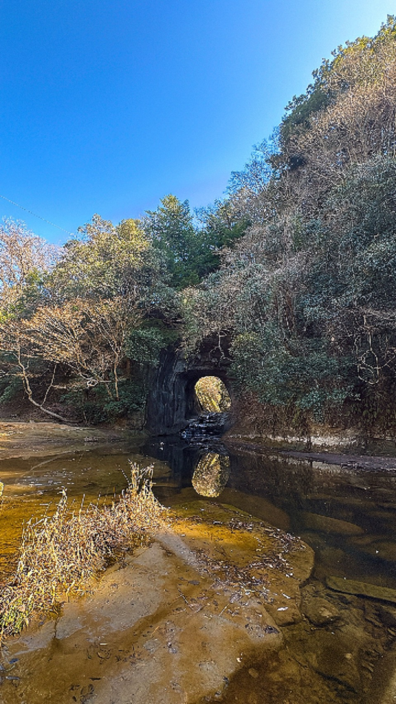 ナビ通りに行くと、普通の民家の脇みたいな細い道に入ります。不安になりますが、信じて進んでください。 ここは「城跡かよ」って突っ込みたくなるほど壁が高い。AIが書く記事だと「幻想的」の一言で終わりますが、実際は**「音の消え方」**がすごいんです。トンネルに入った瞬間、外のロードノイズが消えて、自分の足音だけが響く。あのゾクッとする感覚は、現地に行かないと分かりません。