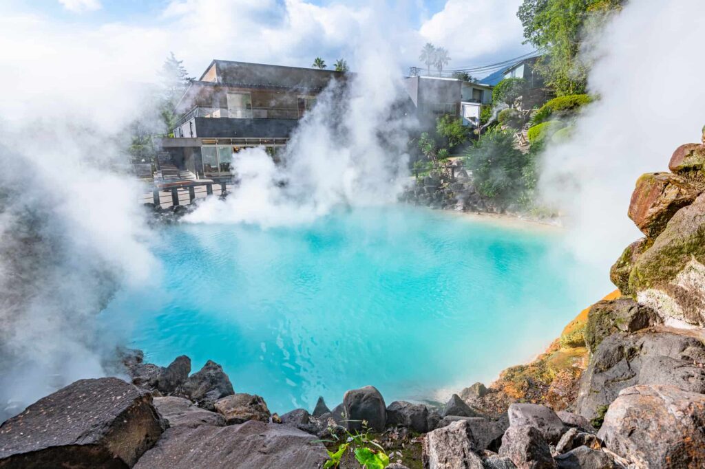 一見すると、南国のリゾート地のような鮮やかな青い池。しかしその美しさに反して、水温はほぼ沸騰レベルの98℃! 高温のため入浴はできませんが、池の周りには熱帯植物園や足湯も整備されており、癒しと神秘が共存しています。
