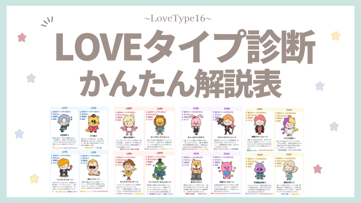 Love Type 16 は、恋愛スタイルを16種類のキャラクターに分類した恋愛診断。自分の恋愛観を客観的に知ることで、恋人との関係を深めたり、相性を考えるヒントになります。あなたはどのラブタイプ?そして相性のいい相手は誰?診断をきっかけに、自分らしい恋愛を楽しんでみましょう。